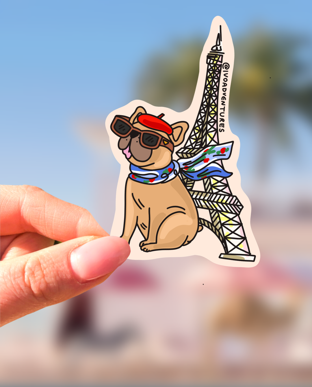Naklejka - Frenchie buldożek w Paryżu - wieża Eiffla